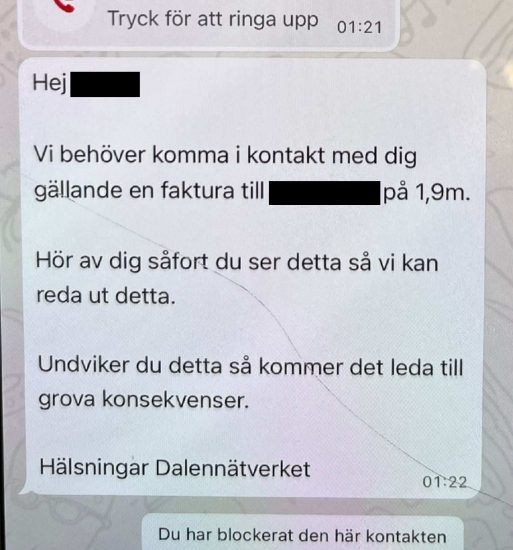 ”Hej [Namn]. Vi behöver komma i kontakt med dig gällande en faktura till [UE:s namn] på 1,9m. Hör av dig så fort du ser detta så vi kan reda ut detta. Undviker du detta så kommer det leda till grova konsekvenser. Hälsningar Dalennätverket”.