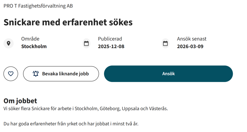 För Tomas Arveteg är uppdraget avslutat. Samtidigt fortsätter företaget att söka ny arbetskraft. PRO T Fastighetsförvaltning annonserar fortfarande efter snickare och målare via Arbetsförmedlingen. När Tomas lämnade hade en målare just anställts.