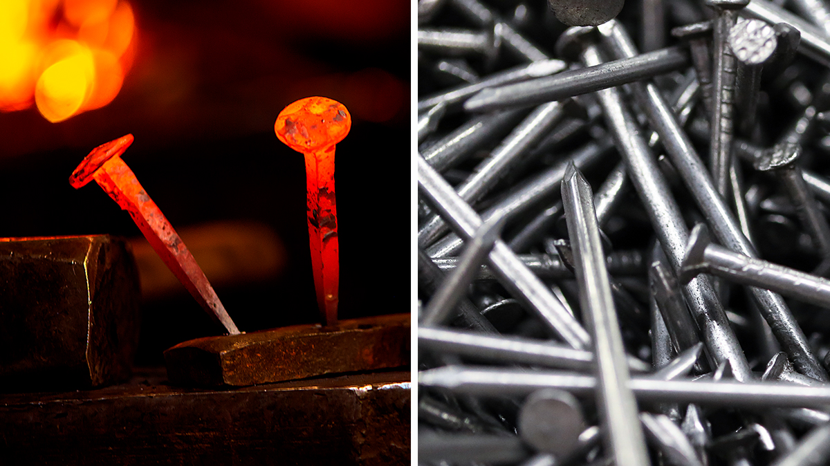 Förr: Handsmidda spikar med fyrkantigt tvärsnitt. Helt okej grepp, men tidskrävande att tillverka.