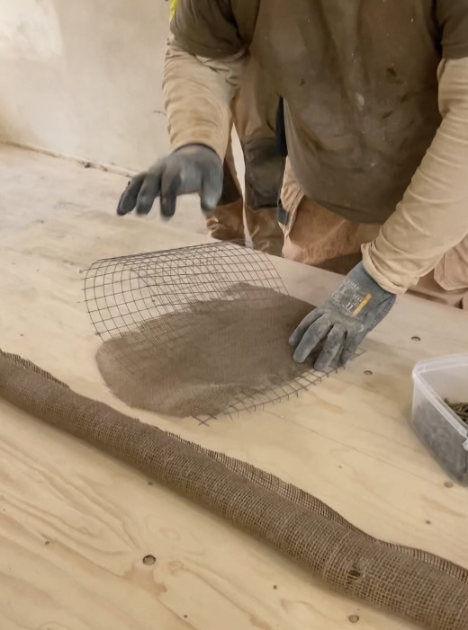 Intill arbetar kollegan Thomas Ulander. Han berättar hur det fungerar med monierputsning. Hur han klipper moniernätet i exakta bitar, spänner upp det över hålen och lägger på puts för hand, lager för lager.