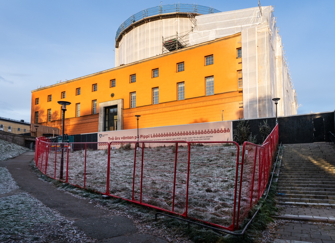 Stadsbibliotekets ikoniska rondellformade byggnad, ritad av Gunnar Asplund och invigd 1928, är just nu helt täckt av ett väderskydd som omsluter hela fasaden. Bakom duken pågår ett av stadens mest omfattande kulturrenoveringsprojekt.