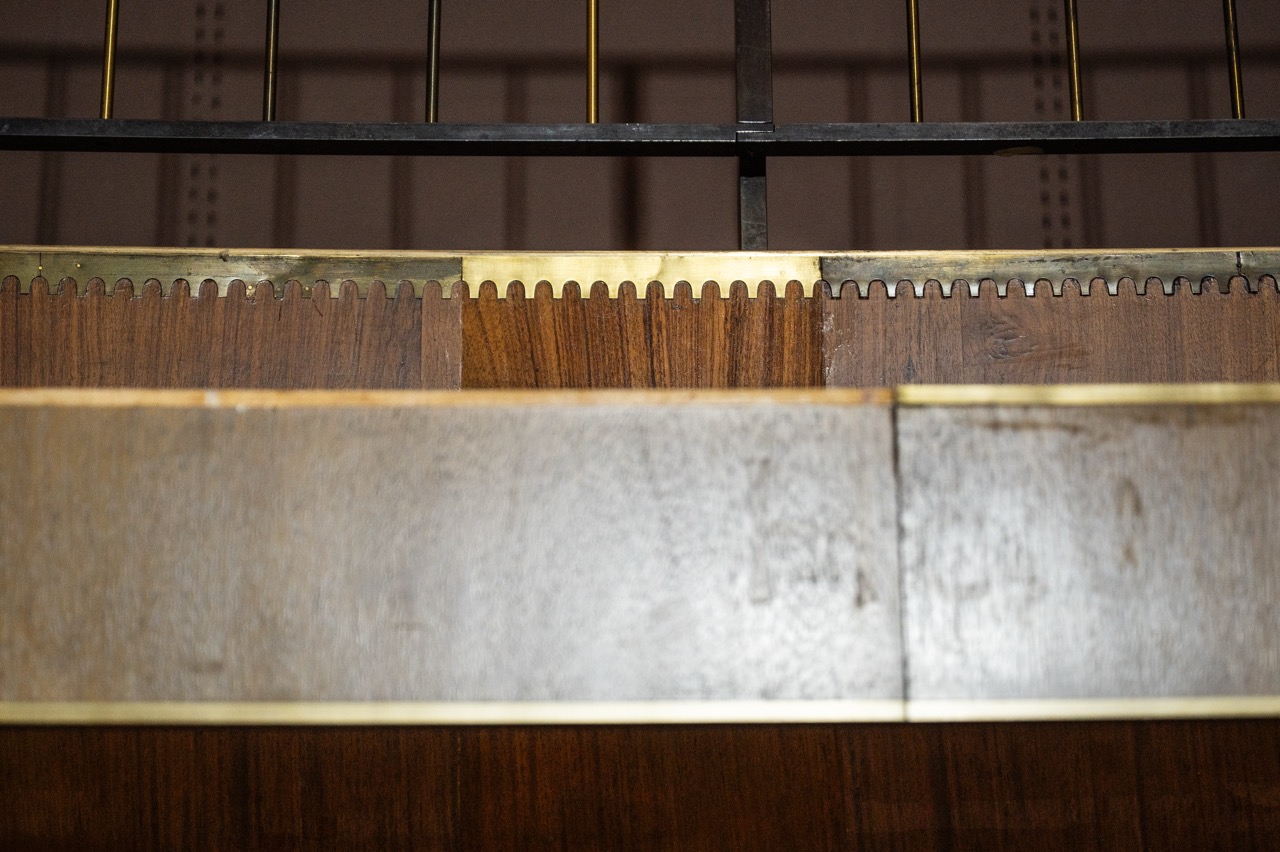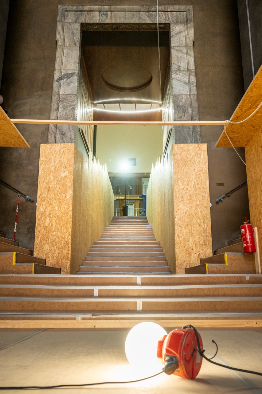 Det allra första som gjordes när bygget startade var att klä in känsliga utsmyckningar i OSB-skivor för att skydda dem. Det gäller framför allt gångarna och trapporna kring rotundan, den del av huset som har högst skyddsklass.