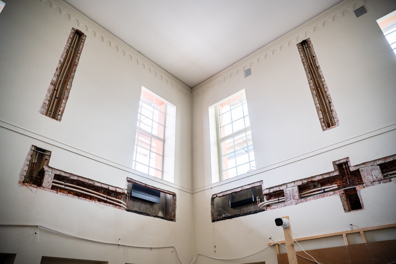 Några våningar längre ner står murarna böjda över väggarna där slitsarna i tegelväggarna gapar öppna efter installationer. Att mura igen och dölja alla spår av rördragningarna är en av de mest tidskrävande delarna av hela renoveringen.