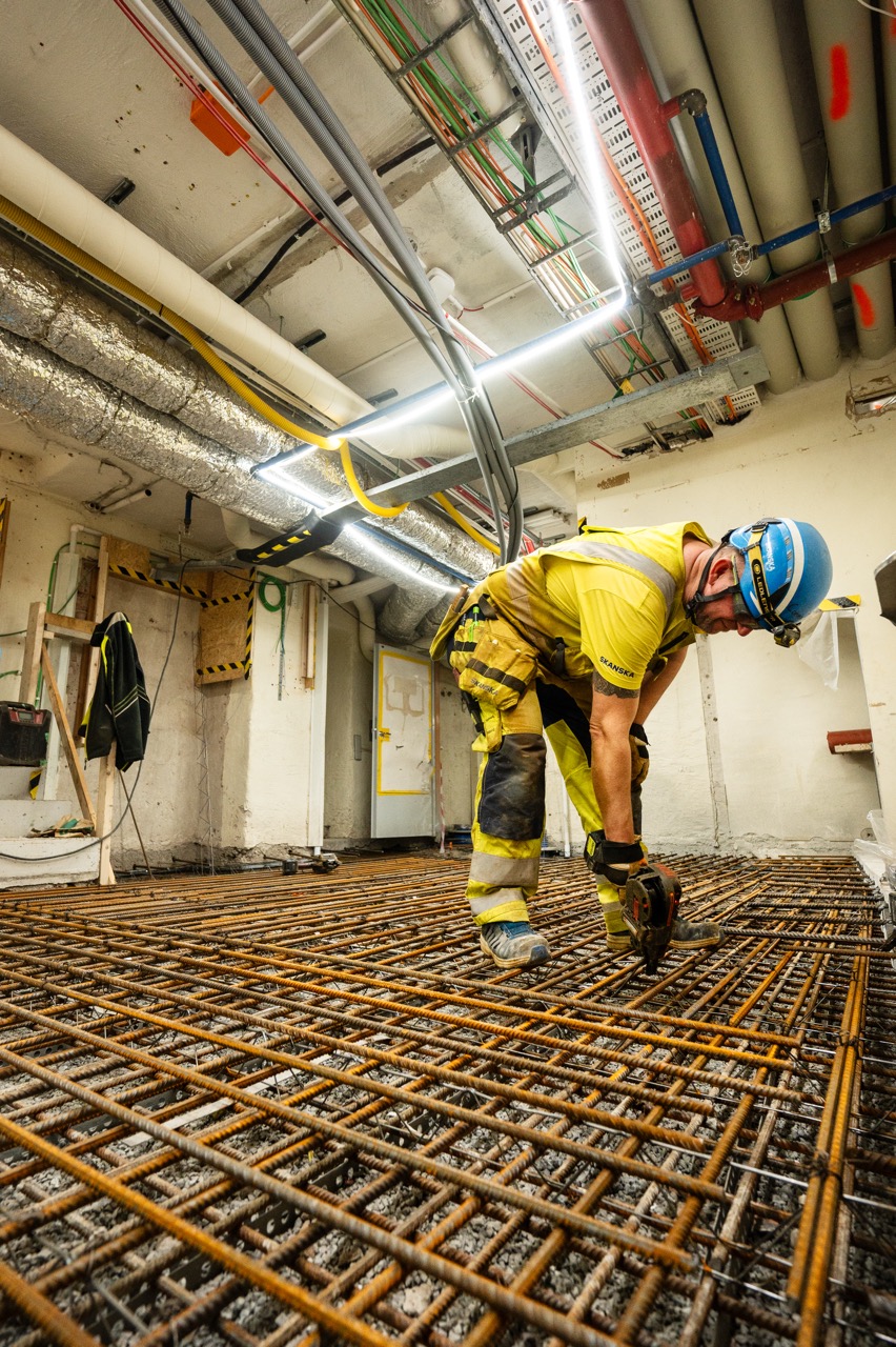 Då verkar livet på jobbet vara enklare. Han har varit på plats i bara några dagar på biblioteket och arbetar just nu med att naja överkantsarmering i källaren. Golven har tidigare bilats upp. Gamla avlopps- och dagvattenrör har ersatts. Det har även lagts in nya rör för kyla som nu slingrar sig upp genom hela byggnaden, från rum till rum. Om några dagar är det dags för gjutning.