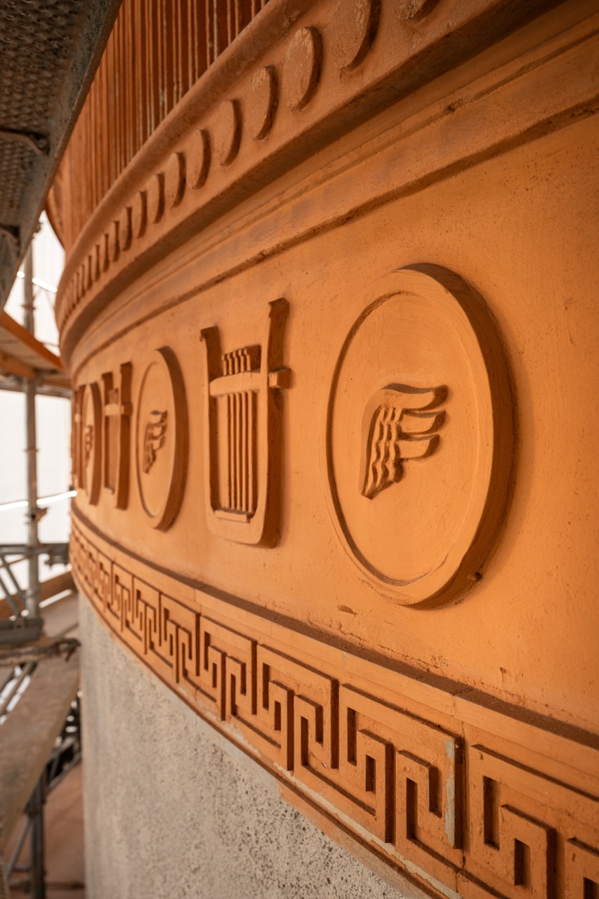 De täckta detaljerna ska restaureras i slutet av byggtiden av specialister när de större byggmomenten är avklarade.