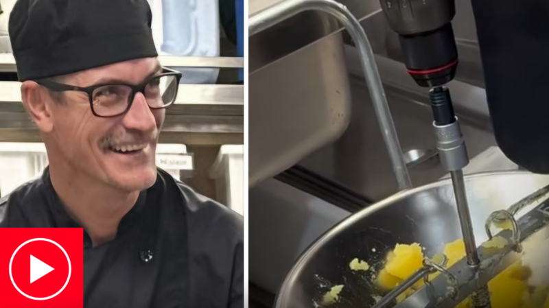 Magnus Wattberg på Saxnäs kök tröttnade på att pressa potatis för hand. Lösningen: en påsvetsad mutter och en borrmaskin. Nu har kockens bygg-hack fått över åtta miljoner visningar på Instagram.