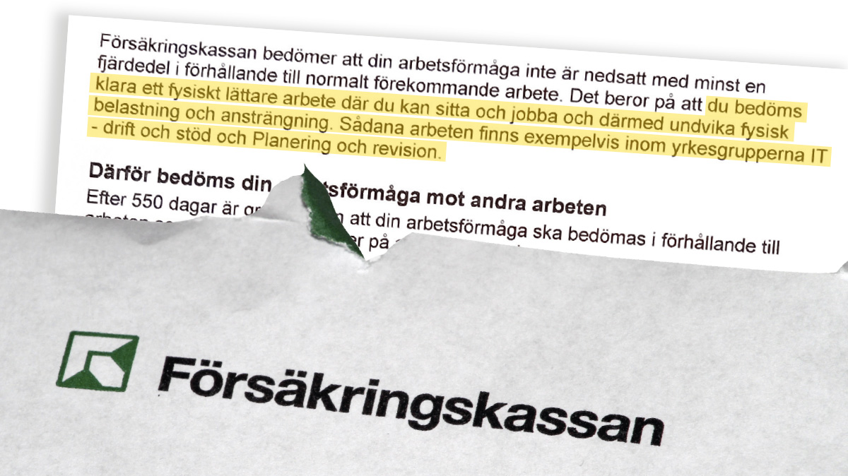 ”Det beror på att du bedöms klara ett fysiskt lättare arbete där du kan sitta och jobba och därmed undvika fysisk belastning och ansträngning”, skriver myndigheten i sin bedömning. De föreslår även var dessa arbeten finns – ”exempelvis inom it-drift och stöd och Planering och revision”.