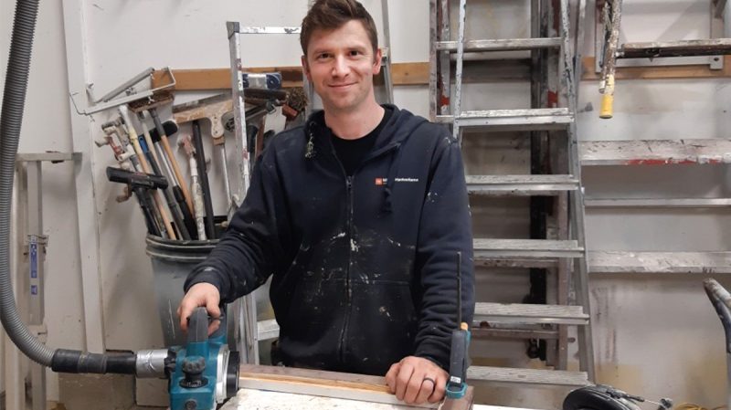– Just nu håller jag på att skruva fast beslag och sen ska jag montera tätningslister, säger Tobias Arwidsson.