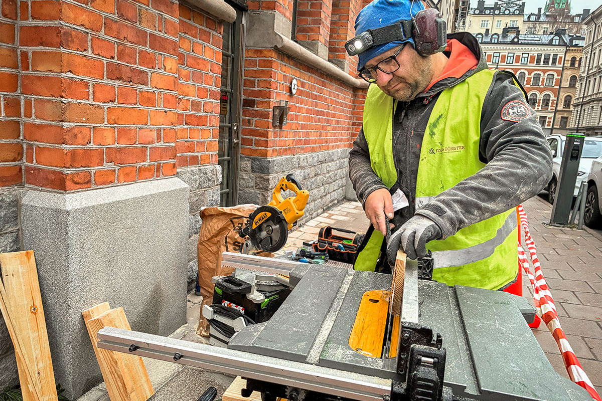 På Tulegatan i centrala Stockholm är snickaren Francisco Vasquez i full gång med att renovera ett dörrblad en småkylig och blöt novembereftermiddag – och vi får fota honom mitt i småpillet.