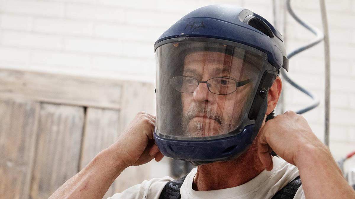 Men lösningsmedel är inte helt borta på P & A Måleri. Målaren Anders Nyvelius tar på sig friskluftsmasken inne i det separata rummet i fönsterverkstaden och kopplar på luften. Han ska göra en halvoljning, vilket krävs på vissa dörrar och fönster.