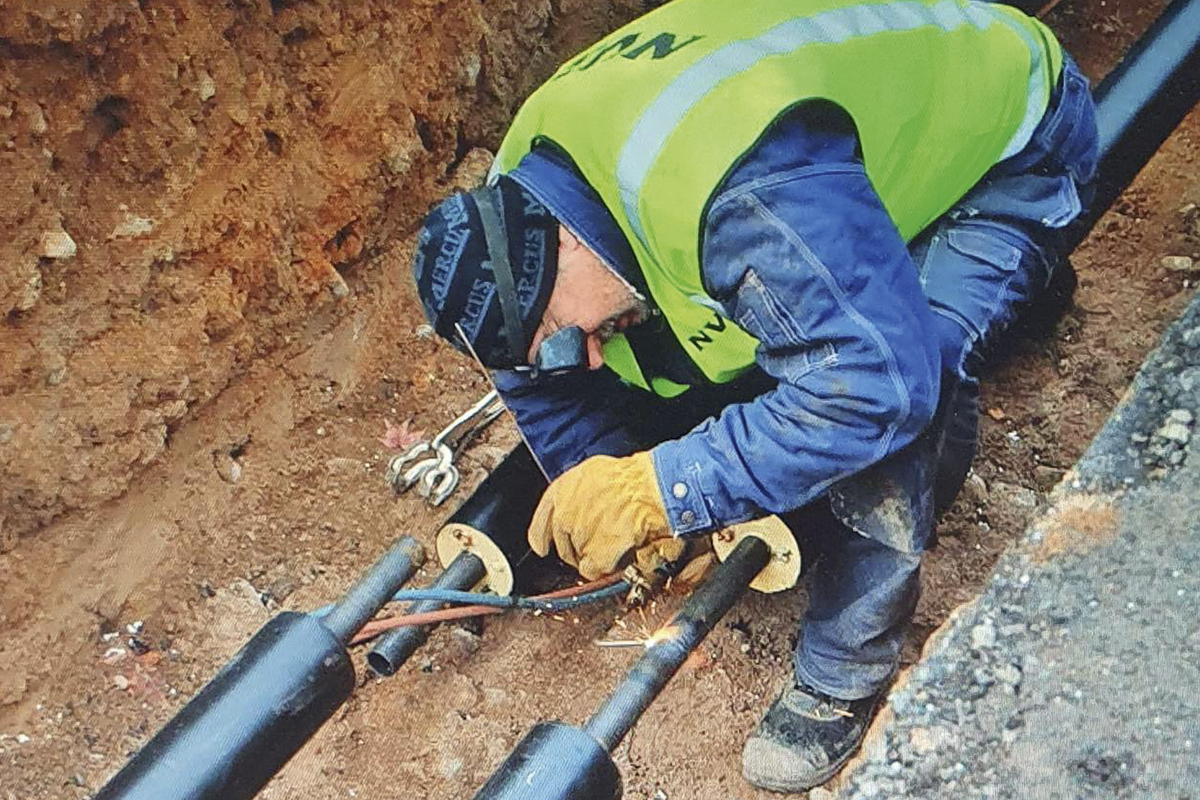 Jobbet innebar många vridna och framåtböjda arbetsställningar, ofta liggande eller stående på knä när rör i diken skulles svetsas ihop.